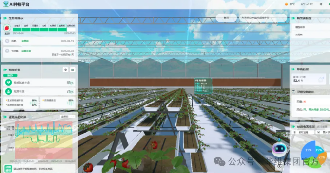 在华维集团的AI种植平台上,无论您身在何处,都能通过手机或电脑,实时看到千里之外基地的作物生长画面与环境数据。这不仅仅是一个监控工具,更是一套“硬件+软件+AI算法”的一体化智能解决方案。