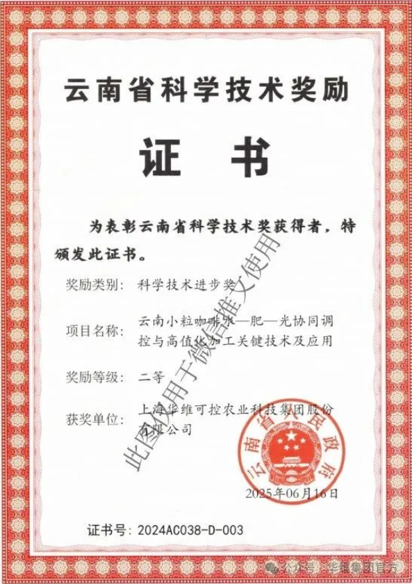 2025年云南省人民政府官网发布《关于2024年度科学技术奖励的决定》,正式将云南省科学技术进步奖二等奖授予上海华维可控农业科技集团股份有限公司(以下简称 “华维集团”)与昆明理工大学、云南农垦咖啡联合申报的 “云南小粒咖啡水 - 肥 - 光协同调控与高值化加工关键技术及应用”项目。