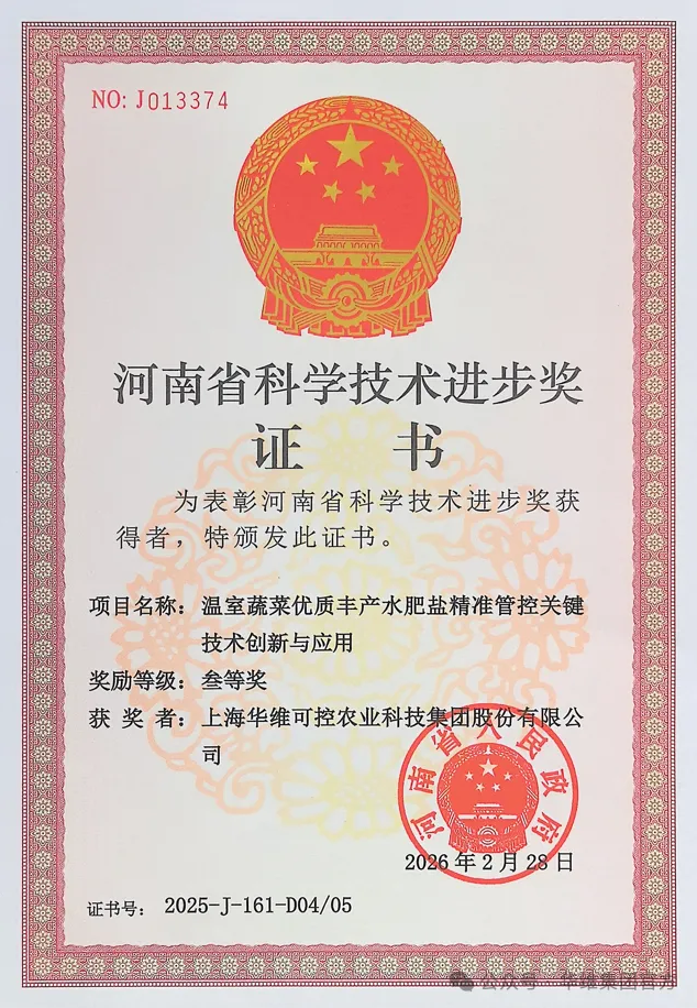 近日,由中国农业科学院农田灌溉研究所、华北水利水电大学、中国农业大学、华维集团、新疆维吾尔自治区农业科学院联合申报的《温室蔬菜优质丰产水肥盐精准管控关键技术创新与应用》项目,荣获河南省科学技术进步奖三等奖。